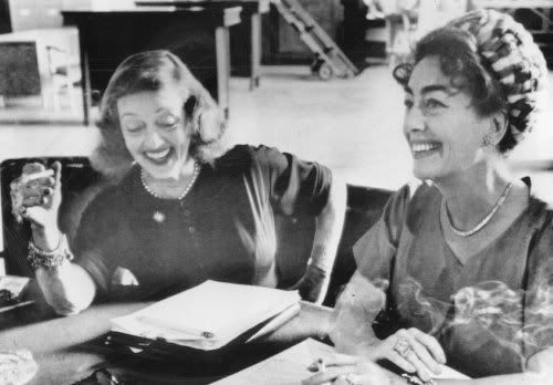 「成人式的女子爭鬥總是伴隨著驚人的權力和魅力」,權力是成熟的,魅力略嫌幼稚又不怕,看見二人幼稚地鬥,局外人的我們實在看得過癮。Joan在40年代由MGM轉投華納,主動要求一間dressing room就在Bette的旁邊。Bette Davis眼看死對頭搶完愛人,又來搶華納一姐的冠冕,當然氣到死,偶爾無意說了句"I wouldn't piss on Joan Crawford if she was on fire",雖然毒,但我覺得很可愛。