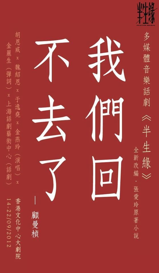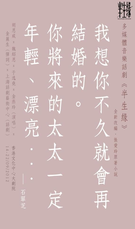 進念‧二十面體製作的半生緣是一套多媒體音樂話劇。想也想不到,這是音樂份量很重的舞台劇。進場時耳邊傳來Gone with the Wind主題曲Tara,令我激動得眼有淚光。這種莫名的感動,是因為喜歡的東西原來可以有關連,彷彿字宙中有人懂你的思緒。