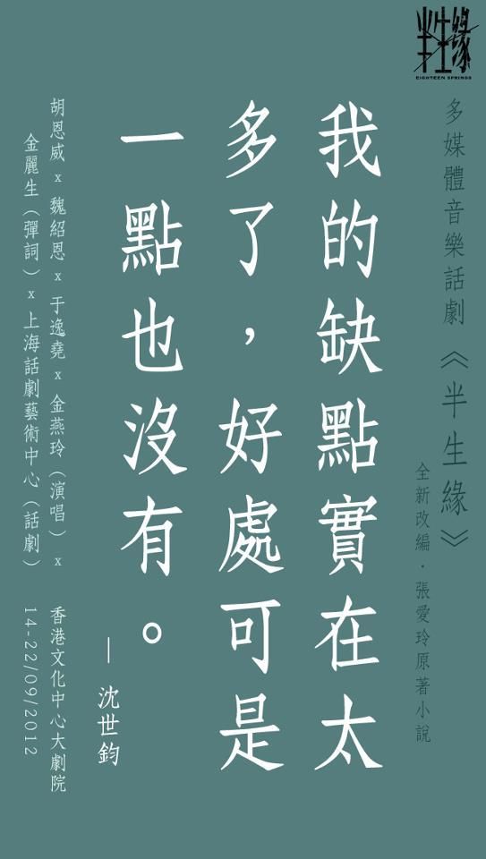 故事大家耳熟能詳,這次描述七個男女十四年的離合也格外出色,過場每每用音樂扣住。金燕玲小姐作為特別演出,本以為她會擔當哪個角色,原來是演張愛玲,原來也不用演,只需唱。于逸堯特地操刀的三首原創歌曲《你也在這裡?》、《重逄/你也在這裡?》和《半生緣》非常動人,尤其是《半生緣》,配合曼楨與世鈞的場景我真的哭慘了。除了金小姐的特別演出音樂,我還是頭一回聽到蘇州評彈,也非常古典,很能配合劇情。